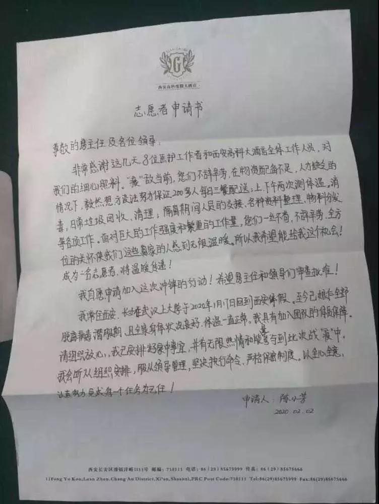 2月1日,解除留觀回家,陳小芳想當(dāng)志愿者的想法獲得了家人的鼓勵(lì)支持。緊接著,她向高新區(qū)留觀點(diǎn)臨時(shí)黨支部遞交了志愿者申請(qǐng)書。其中寫道:“面對(duì)巨大的工作強(qiáng)度和繁重的工作量,您們一絲不茍,不辭辛勞,全方位的關(guān)懷使我們這些離家的人感到無限溫暖。所以我希望我也能成為一名志愿者,將溫暖傳遞,我自愿申請(qǐng)加入這次沖鋒行動(dòng)!”