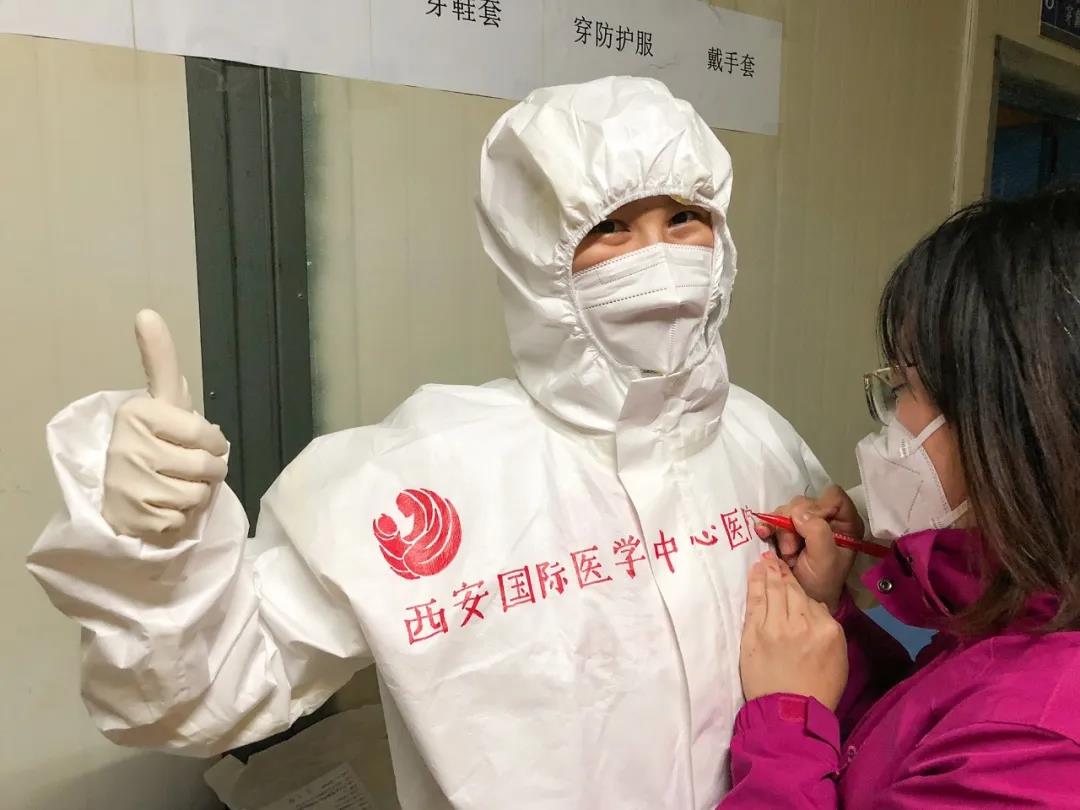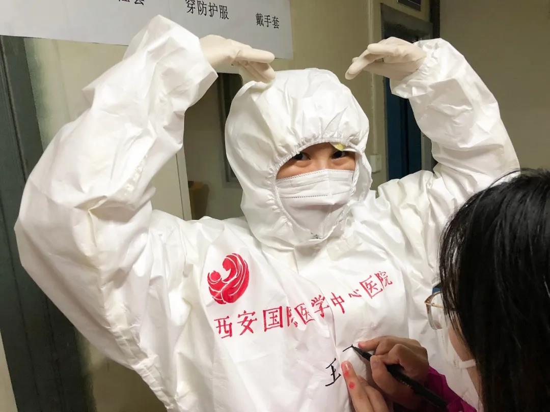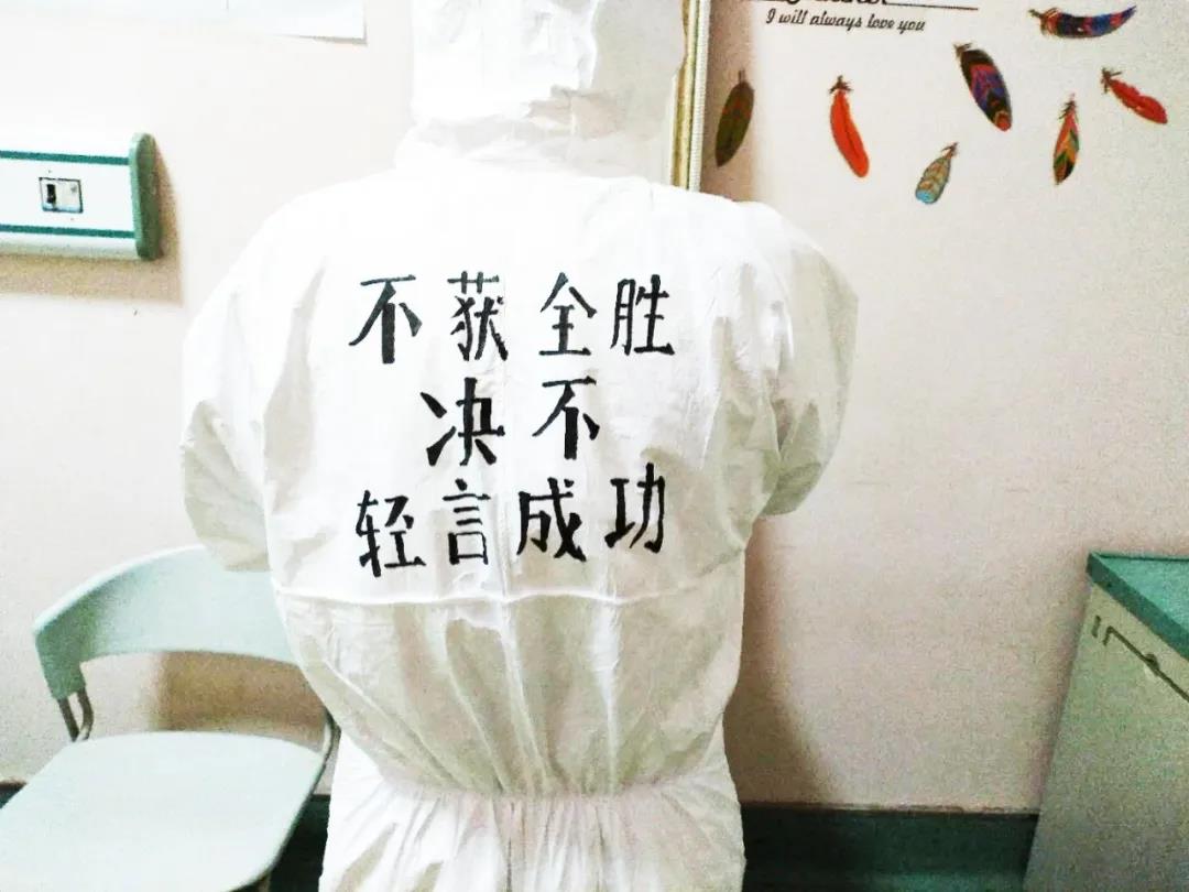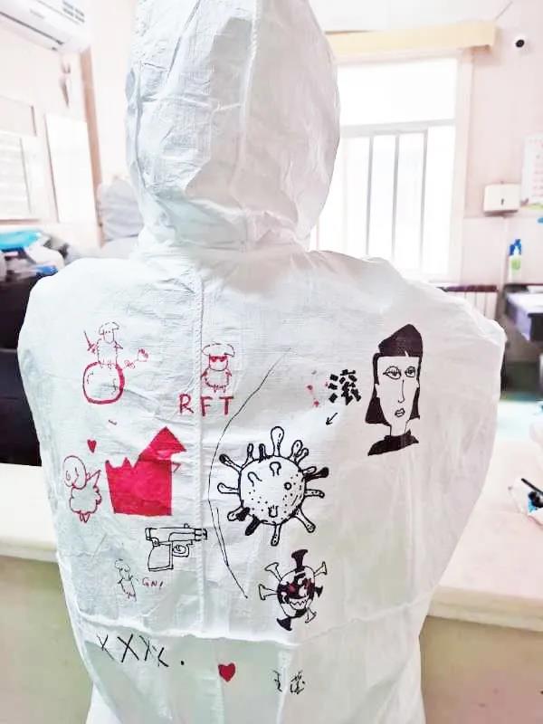 西安國際醫(yī)學(xué)中心醫(yī)院援鄂醫(yī)療隊(duì)醫(yī)護(hù)隊(duì)員都有一身特別的白袍,手繪版防護(hù)服上有國際醫(yī)學(xué)的logo?!安猾@全勝絕不輕言成功”、“武漢加油”的娟秀字跡提升士氣,醫(yī)護(hù)人員擊敗新冠病毒的漫畫也鼓舞人心。