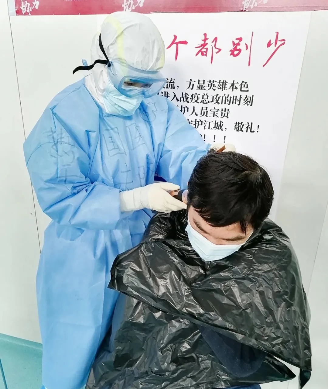 1艙有康復人員想理發(fā),手頭沒有工具,朱晴護士長得知后,聯(lián)系下個班次護士帶來推子,給大家理發(fā)?!翱茨銊幼骱軏故彀。郧熬氝^的吧”,“圍觀群眾”打趣道?!艾F(xiàn)學現(xiàn)賣,大家要求不要太高,有壓力啊!”朱晴說。一直推到推子沒電,朱晴給6位康復人員簡單修剪了頭發(fā)。得知朱晴是西安醫(yī)療隊的護士,大家都親切的稱她“肉夾饃”!