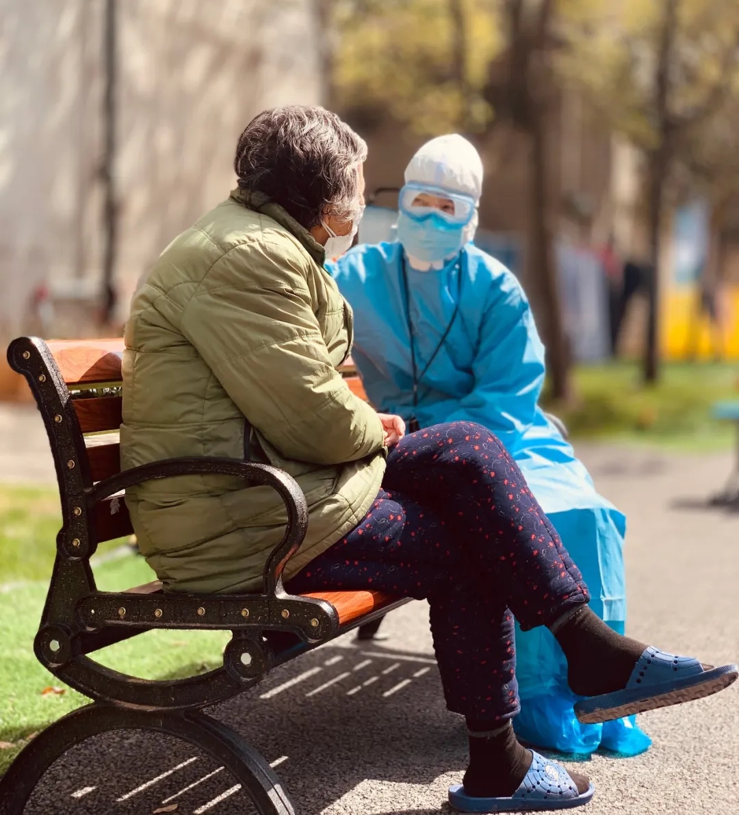 8艙有一位80多歲的老奶奶,中午出來遛彎時看到了醫(yī)療隊護士萬珍妮,主動過來攀談?!澳闶顷兾鱽淼??我看你衣服上寫著西安幾個字了?!薄笆前?,奶奶,我們是西安國際醫(yī)學中心醫(yī)院來武漢支援的。”萬珍妮通過和奶奶聊天得知,奶奶的父親以前在寶雞工作過很長時間?!拔乙菜惆雮€陜西人了。沒想到在這里還能見到“老鄉(xiāng)”!感謝你們!”奶奶感覺很親切,和萬珍妮話起了“家?!?。