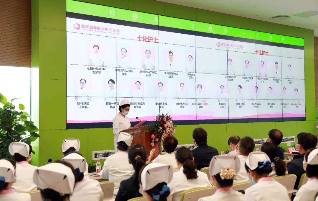 隨后,院領導為“十佳護士”頒獎,心臟外科ICU劉夢馨、呼吸內科二病區(qū)李昭、神經內科二病區(qū)孫歡、神經疾病DSA古超、消化ICU羅紅、婦科診區(qū)王曉凡、腫瘤一病區(qū)韓靜、感染性疾病科申歡歡、重癥醫(yī)學科康菲、麻醉手術中心賈歡獲此殊榮。6位“十佳護士”代表做了先進事跡匯報,追尋著南丁格爾的足跡,他們暢談了在醫(yī)院成長的經歷,分享了戰(zhàn)疫故事,表明了立志為護理事業(yè)奮斗終生的決心,踐行“珍惜每一次服務,一次做好”的信心。
