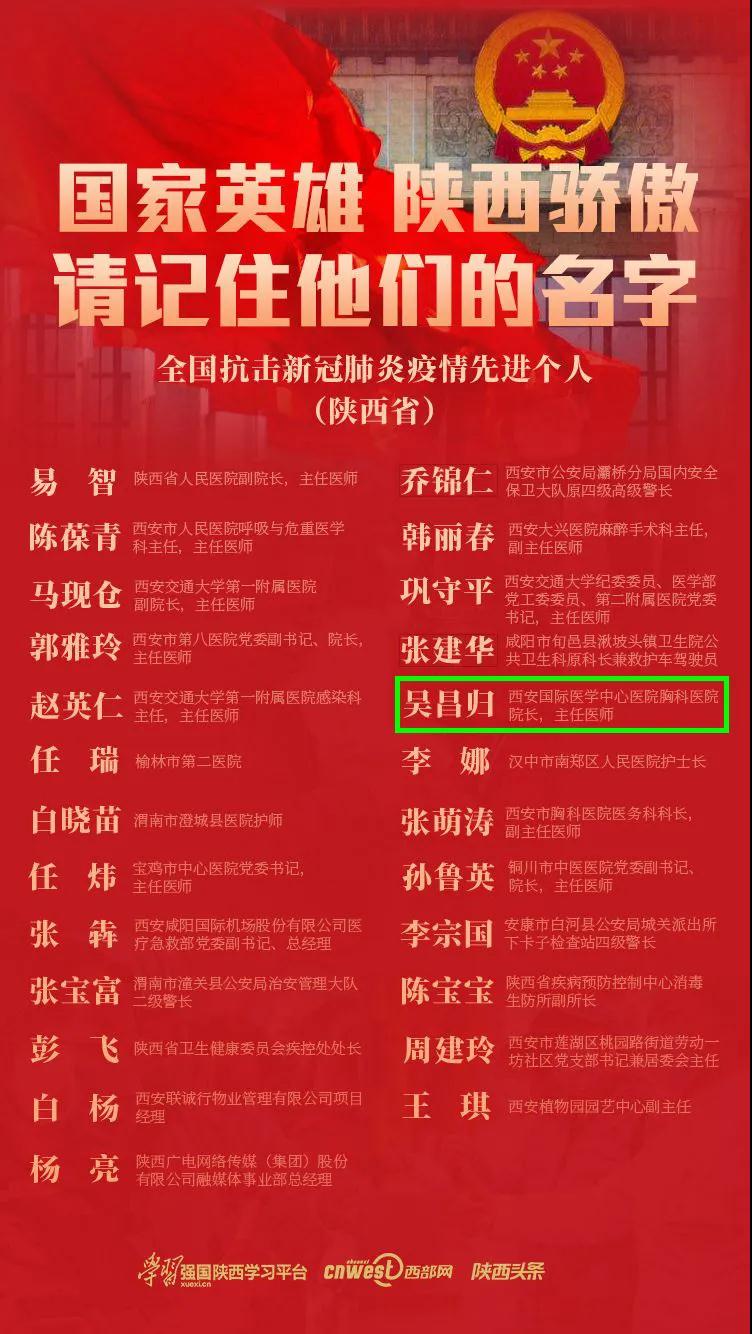 吳昌歸表示,受到黨和國家的表彰,聆聽了總書記的講話,我非常激動。這份榮譽不僅是對個人的褒獎,更是對西安國際醫(yī)學330名抗疫英雄的肯定!作為一名老軍人、老黨員、呼吸專業(yè)的老醫(yī)生,在這場戰(zhàn)疫中,我深深感受到了社會主義制度的無比優(yōu)越,真正感悟到“沒有共產(chǎn)黨就沒有新中國”的深刻內(nèi)涵。