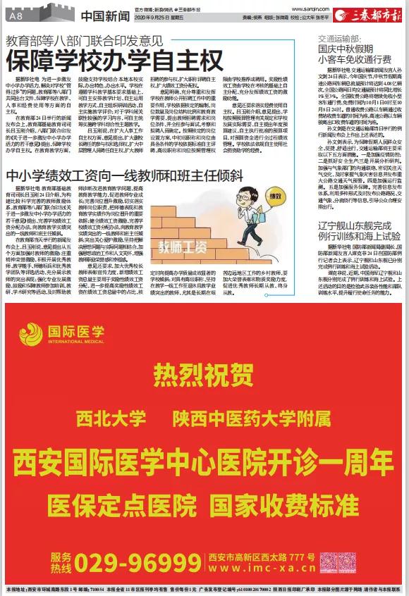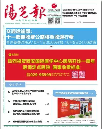 2020年9月25日,在西安國(guó)際醫(yī)學(xué)中心醫(yī)院一周歲生日之際,陜西日?qǐng)?bào)、西安晚報(bào)、華商報(bào)、三秦都市報(bào)、陽(yáng)光報(bào)分別刊文送上生日祝福。