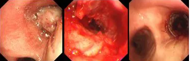 原來,秦爺爺入院時(shí)診斷為“右主支氣管”鱗狀細(xì)胞癌伴壞死。他的右主支氣管被腫瘤完全堵塞,混合性狹窄。面罩吸氧10升/分的狀況下,指脈氧只有85%,無法平躺,呼吸困難,病情十分危急,隨時(shí)有生命危險(xiǎn)。