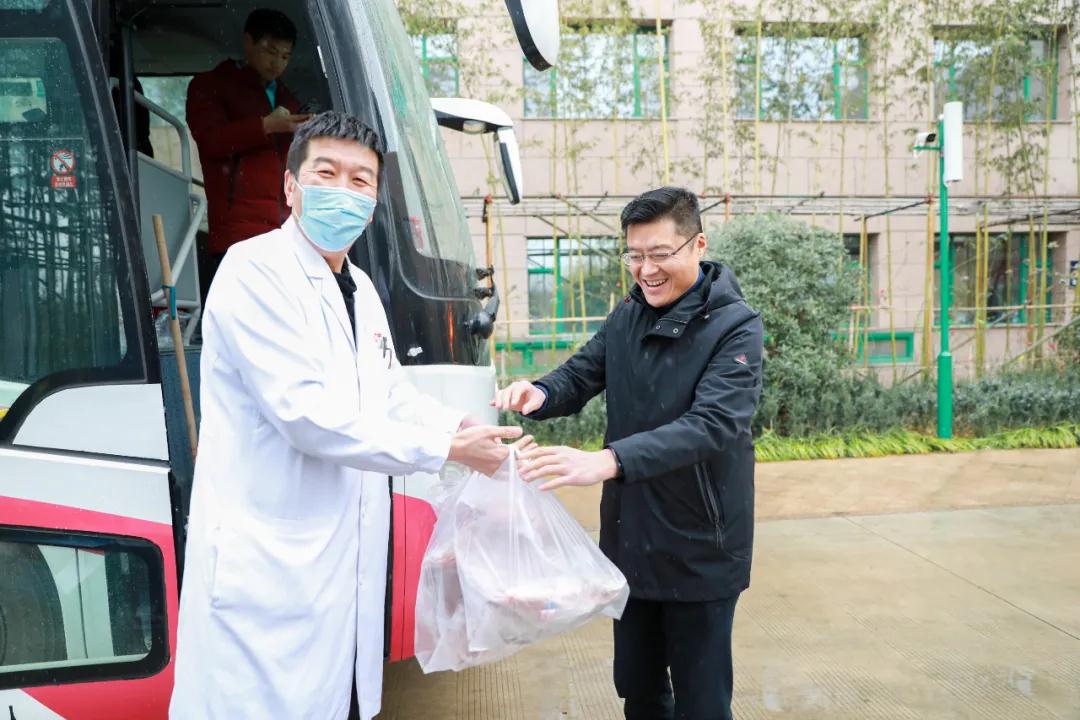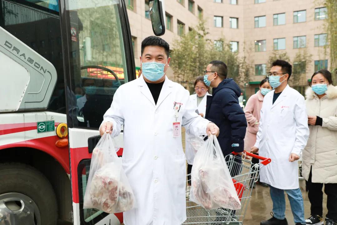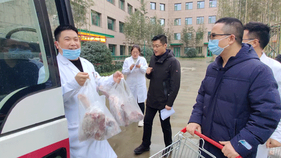當(dāng)日上午,蒙古國捐贈的486箱冷凍羊乘“接運專車”到達(dá)陜西西安。按照國家統(tǒng)一部署,羊經(jīng)過嚴(yán)格檢驗檢疫加工后轉(zhuǎn)運陜西省,分配給前往湖北參與新冠肺炎疫情醫(yī)療救治工作的醫(yī)療隊員。我院收到100箱捐贈羊。下午五點,張良院長助理帶領(lǐng)綜合辦公室工作人員,將一袋袋羊肉發(fā)到醫(yī)療隊隊員們手中。