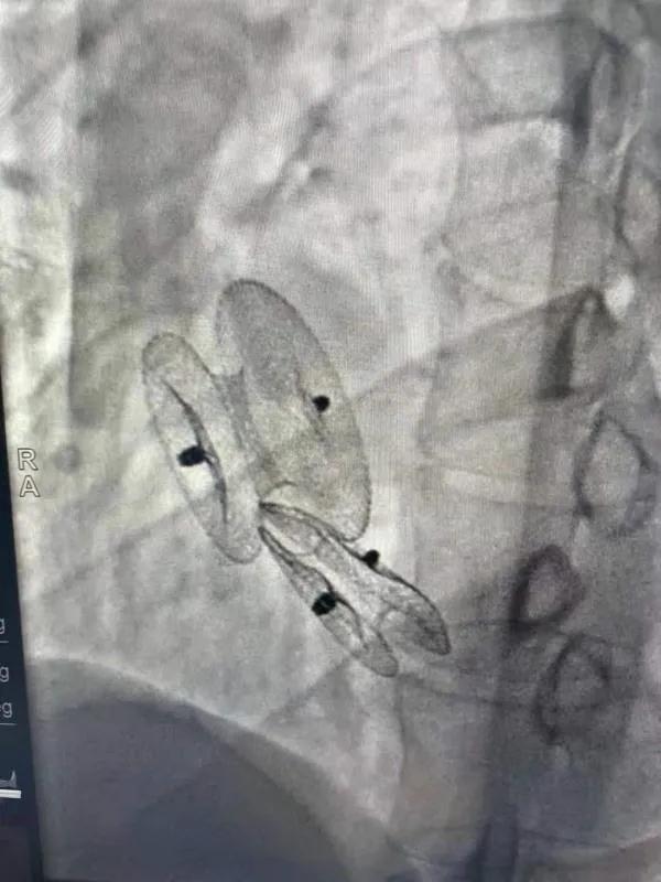 在詳細了解患者病情,仔細閱讀患者影像資料后,曾廣偉主任已經(jīng)有了清晰的手術策略。在精心的準備和團隊的配合下,曾主任順利的利用兩個封堵器對房缺進行了封堵。