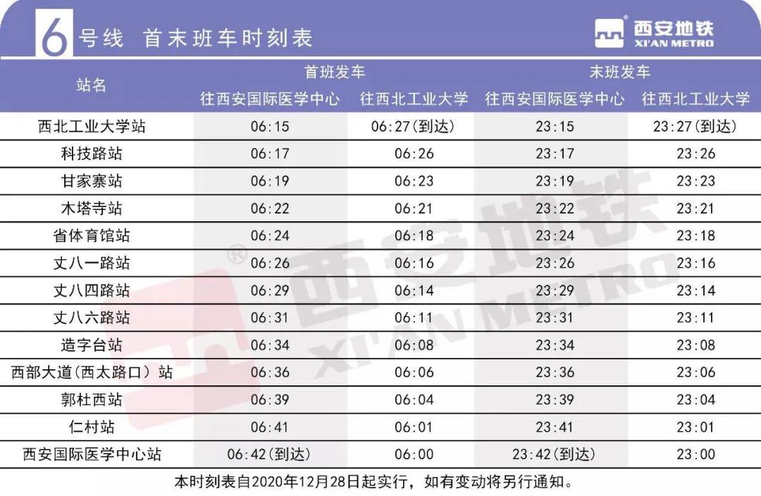 6號線一期開通初期全天開行單一交路,單程行駛時間為27分鐘。6號線一期西安國際醫(yī)學(xué)中心首末班車發(fā)車時間分別為6: 00、23: 00, 西北工業(yè)大學(xué)首末班車發(fā)車時間分別為6: 15、23: 15,全天運(yùn)營服務(wù)時間17小時43分。線路總體分布情況如圖: