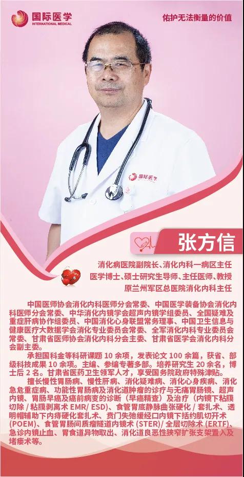 張方信擔任中國醫(yī)師協(xié)會消化內(nèi)科醫(yī)師分會常委,中國醫(yī)學裝備協(xié)會消化內(nèi)科醫(yī)師分會常委,中華消化內(nèi)鏡學會超聲內(nèi)鏡學組委員,中華消化心身聯(lián)盟常委,全國疑難及重癥肝病協(xié)作組委員,全軍消化內(nèi)科專業(yè)委員會常委等職務。從醫(yī)四十余載,他對慢性胃腸病、慢性肝病、消化疑難病、消化心身疾病、消化急危重癥病與消化道腫瘤具有豐富的診治經(jīng)驗。擅長超聲內(nèi)鏡、胃腸早癌內(nèi)鏡精查及其內(nèi)鏡下微創(chuàng)治療。