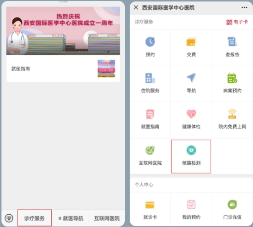 有需要住院、陪護(hù)的應(yīng)檢盡檢或愿檢盡檢人群,可關(guān)注“西安國際醫(yī)學(xué)中心醫(yī)院服務(wù)號”后,在【診療服務(wù)】——【核酸檢測】功能中自助開單,支付后前往西安國際醫(yī)學(xué)中心醫(yī)院急診門口預(yù)檢分診點北側(cè)核酸檢測室完成采樣檢測。檢測結(jié)果可在西安國際醫(yī)學(xué)中心醫(yī)院服務(wù)號——【診療服務(wù)】——【查報告】中查看,也可在“西安市民一碼通”——【核酸結(jié)果查詢】中查看。