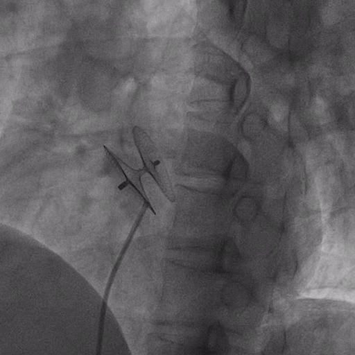 在獲得患者同意后,1月12日,尚福軍主任為患者進行了PFO封堵術。術中造影可見封堵器殘余漏,尚福軍主任用精湛的技藝,順利通過封堵器殘余漏裂縫,將右心導管從右房送入左房,且順利到達肺靜脈;遂行卵圓孔未閉封堵術后殘余漏再次封堵;且完美釋放PFO封堵器,可見兩封堵器呈“馬蹄蓮”狀,再次術中造影未見殘余漏。