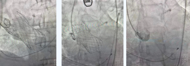 術(shù)中,曾廣偉主任團(tuán)隊高效配合,完成了特定時間點起搏心臟、臨時短時間關(guān)閉呼吸機(jī)、降低主動脈瓣阻力、快速釋放瓣膜等一系列高難度操作,有效保證瓣膜精準(zhǔn)釋放。瓣膜釋放經(jīng)TEE確認(rèn),主動脈瓣膜釋放位置佳,經(jīng)豬尾導(dǎo)管造影,主動脈瓣返流即刻消失,且無瓣周瘺。