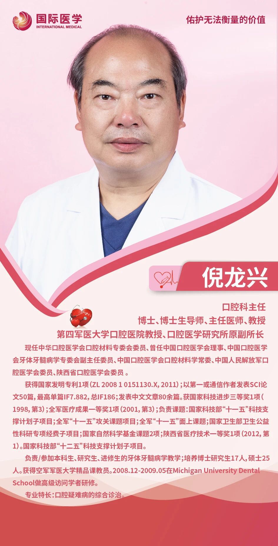 有了源動(dòng)力驅(qū)動(dòng),倪龍興沉下心,把自己當(dāng)成一塊原石去磨礪,在牙體牙髓領(lǐng)域一干就是三十多年,2008年前往密歇根大學(xué)牙學(xué)院做高級(jí)訪問(wèn)學(xué)者研修,參與完成氟磷灰石修飾支架在細(xì)胞礦化中的自噬調(diào)節(jié)研究等課題。工作期間獲國(guó)家發(fā)明專(zhuān)利1項(xiàng)、以第一或通信作者發(fā)表SCI論文50篇;獲得國(guó)家科技進(jìn)步三等獎(jiǎng)1項(xiàng)、全軍醫(yī)療成果一等獎(jiǎng)1項(xiàng)、陜西省科技進(jìn)步一等獎(jiǎng)1項(xiàng);負(fù)責(zé)國(guó)家自然科學(xué)基金、國(guó)家科技部“十一五”和“十二五”科技支撐計(jì)劃子項(xiàng)目、全軍“十一五”攻關(guān)課題項(xiàng)目和面上項(xiàng)目等課題研究;負(fù)責(zé)本科生、研究生的牙體牙髓病學(xué)教學(xué)工作,培養(yǎng)博士17人、碩士25人、獲得空軍軍醫(yī)大學(xué)精品課教員稱號(hào)。