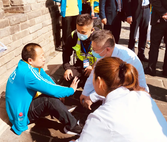 比賽期間,全體參賽人員憑借頑強(qiáng)拼搏的精神和追趕超越的熱情,勇往直前、突破自我,堅(jiān)持跑完整個(gè)賽事全程。活動(dòng)進(jìn)行半小時(shí)左右,一位阿姨快速向醫(yī)療服務(wù)站走來,尋求幫助?!澳沁呌腥送蝗徊皇娣?,該怎么辦啊?”阿姨說。