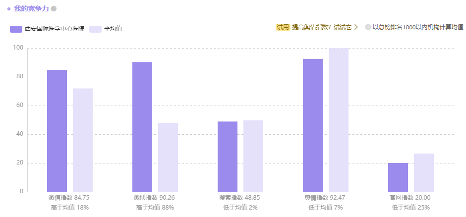 丁香園收錄了全國2000 醫(yī)院的品牌指數(shù),其中包括公立醫(yī)院與非公立醫(yī)院。榜單顯示:西安國際醫(yī)學(xué)中心醫(yī)院綜合排名第19名(較上周上升36個(gè)名次);醫(yī)院品牌指數(shù)68.79;微信指數(shù);84.75(高于平均值18%);微博指數(shù)90.26(高于平均值88%);搜索指數(shù)48.85(高于平均值2%);官網(wǎng)指數(shù)20(低于均值25%);輿情指數(shù)92.47(低于均值7%,正面輿情>負(fù)面輿情)。
