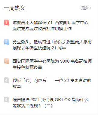 西安國際醫(yī)學(xué)中心醫(yī)院微信公眾號(hào)發(fā)布的《這些費(fèi)用大幅降低了!西安國際醫(yī)學(xué)中心醫(yī)院完成醫(yī)療收費(fèi)標(biāo)準(zhǔn)切換工作》《西安國際醫(yī)學(xué)中心醫(yī)院為9000余名高校師生接種新冠疫苗》《傾聽心的聲音——一位22歲患者講的故事》3篇文章入選丁香園丁香號(hào)的一周熱文榜單前五名。