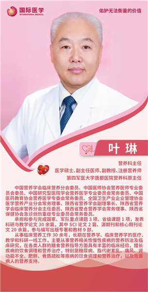 第四軍醫(yī)大學(xué)碩士畢業(yè)后,葉琳進(jìn)入唐都醫(yī)院營(yíng)養(yǎng)科工作,憑借豐富的臨床經(jīng)歷和積累的營(yíng)養(yǎng)指導(dǎo)經(jīng)驗(yàn),一步一個(gè)腳印,從普通醫(yī)生做到科主任,一干就是近二十年。葉琳在疾病的飲食調(diào)理和營(yíng)養(yǎng)治療方面經(jīng)驗(yàn)豐富,尤其擅長(zhǎng)糖尿病、脂代謝紊亂、痛風(fēng)、腎功能不全、肥胖、骨質(zhì)疏松等疾病的飲食調(diào)理和危重病人的營(yíng)養(yǎng)支持。