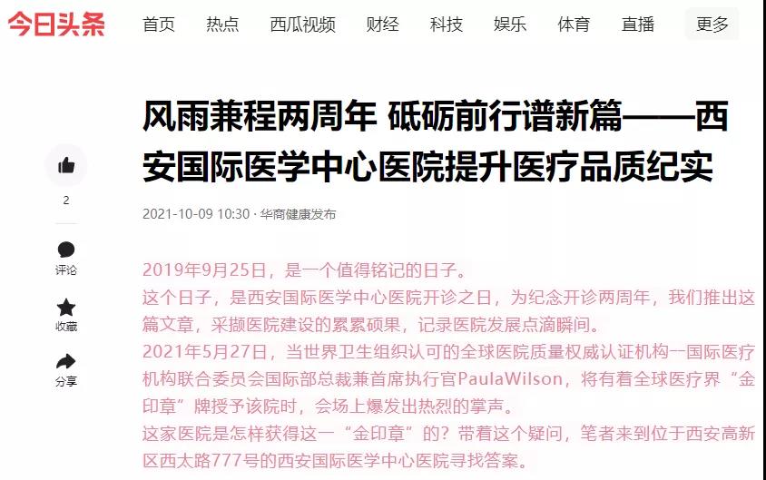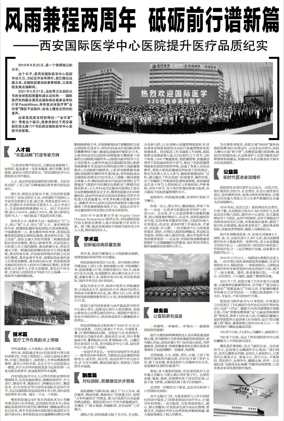今日《華商報(bào)》A8版用整版的篇幅刊登了《風(fēng)雨兼程兩周年 砥礪前行譜新篇——西安國(guó)際醫(yī)學(xué)中心醫(yī)院提升醫(yī)療品質(zhì)紀(jì)實(shí)》。華商報(bào)以圖文并茂的形式記錄了醫(yī)院建設(shè)的點(diǎn)滴瞬間,全方位、多角度報(bào)道了醫(yī)院兩年來的發(fā)展碩果。