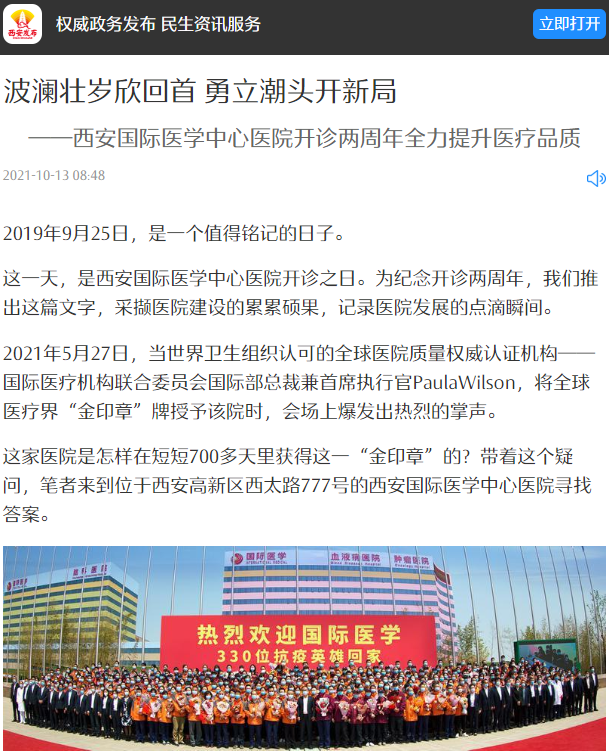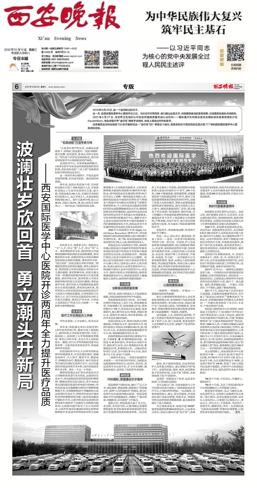 編者按:今日,《西安晚報(bào)》A8版用整版刊登了《波瀾壯歲欣回首 勇立潮頭開新局——西安國(guó)際醫(yī)學(xué)中心醫(yī)院提升醫(yī)療品質(zhì)紀(jì)實(shí)》,以圖文并茂的形式記錄了醫(yī)院發(fā)展的點(diǎn)滴瞬間,展現(xiàn)了西安國(guó)際醫(yī)學(xué)中心人一路向前的奮斗豪情。