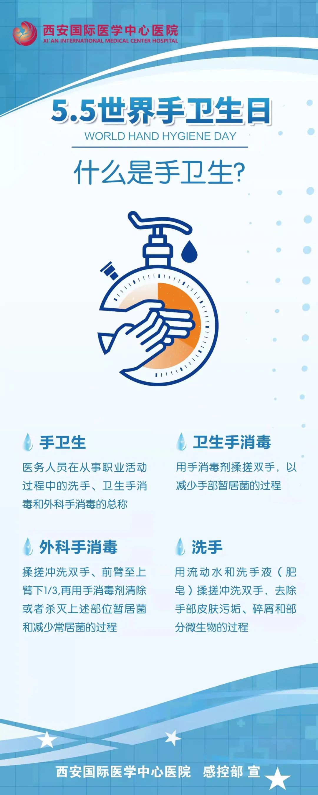 今年的5月5日是第十四個(gè)“世界手衛(wèi)生日”,主題為“團(tuán)結(jié)一致,為了安全,清潔你的雙手”,旨在提高醫(yī)護(hù)人員手衛(wèi)生意識,減少醫(yī)源性感染。