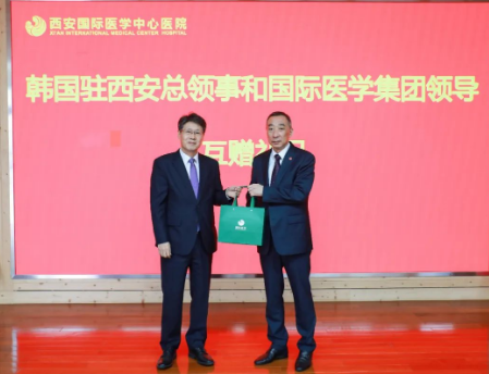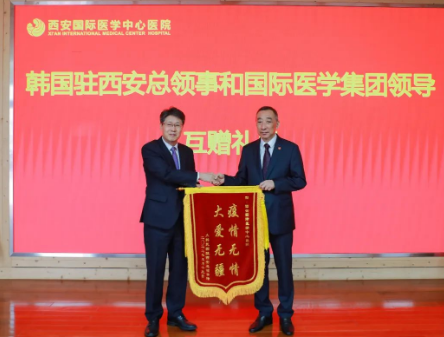 隨后,韓國駐西安總領(lǐng)事館向西安國際醫(yī)學(xué)中心醫(yī)院贈送錦旗,雙方互贈禮物并合影留念。