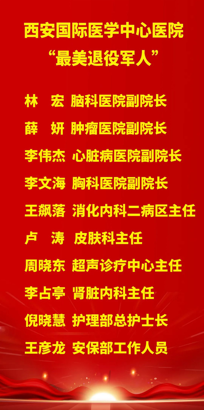李武平副院長宣讀了表彰名單,林宏、薛妍、李偉杰、李文海、王飆落、盧濤、周曉東、李占亭、倪曉慧、王彥龍10名同志被評(píng)為“西安國際醫(yī)學(xué)中心醫(yī)院最美退役軍人”。