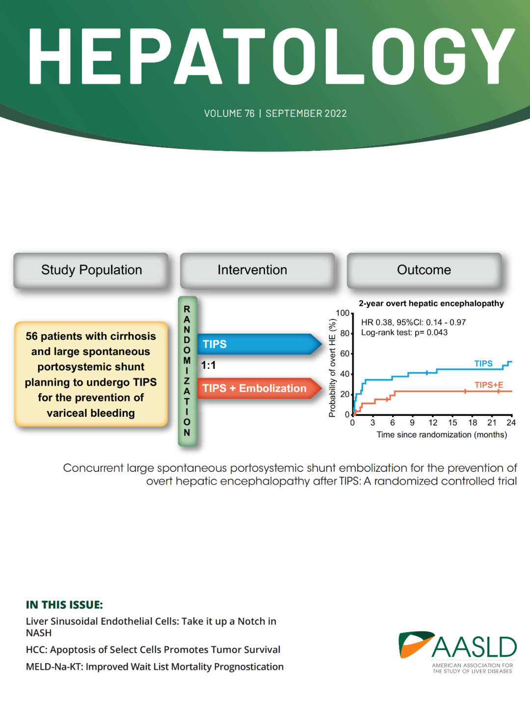 新近,西安國(guó)際醫(yī)學(xué)中心醫(yī)院消化病醫(yī)院韓國(guó)宏教授團(tuán)隊(duì)的一項(xiàng)隨機(jī)對(duì)照試驗(yàn)“經(jīng)頸靜脈肝內(nèi)門(mén)體靜脈分流術(shù)(TIPS)聯(lián)合自發(fā)性門(mén)體分流封堵預(yù)防術(shù)后顯性肝性腦病”的論著被最新一期的Hepatology雜志(IF=17.29,JCR:Q1)遴選為9月份封面文章(圖1)。該研究顯示TIPS聯(lián)合粗大分流道封堵能夠有效降低TIPS術(shù)后顯性肝性腦病的發(fā)生率,且不增加門(mén)靜脈高壓、分流道功能障礙和其他不良事件的并發(fā)癥風(fēng)險(xiǎn)[1]。