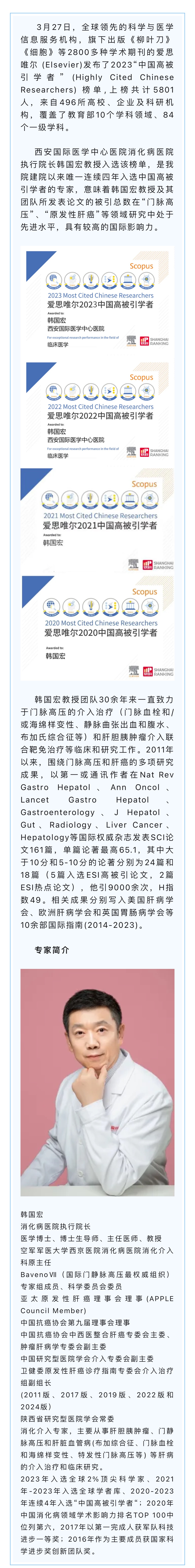 韓國宏教授連續(xù)4年入選“中國高被引學(xué)者”榜單!