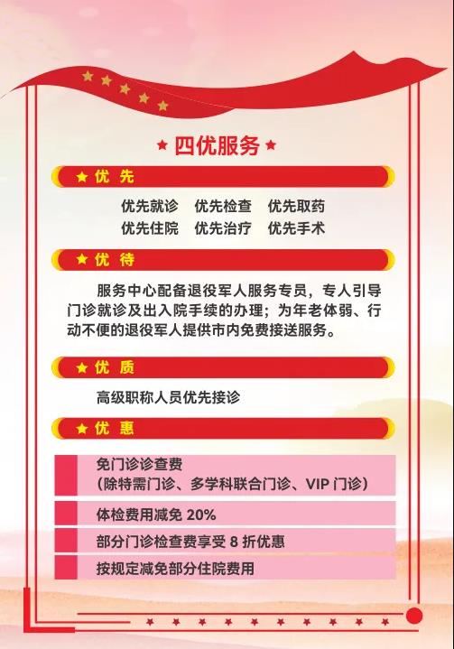 長期以來,醫(yī)院把“尊崇軍人,致敬軍屬”落到實(shí)處。一是對退役軍人實(shí)行優(yōu)撫。對退、現(xiàn)役軍人及其配偶和未成年子女;因公犧牲軍人直系親屬;軍隊(duì)離退休干部及退休士官;在鄉(xiāng)退伍紅軍老戰(zhàn)士、在鄉(xiāng)西路軍紅軍老戰(zhàn)士、“三紅”人員;殘疾軍人;在鄉(xiāng)復(fù)員軍人等優(yōu)撫對象來院享受門診就診優(yōu)先;住院優(yōu)先;窗口手續(xù)辦理優(yōu)先;檢驗(yàn)檢查優(yōu)先;城區(qū)范圍內(nèi)救護(hù)車免費(fèi)接送(預(yù)約電話:029—966120);特殊人員一對一陪診。二是優(yōu)撫對象就診時享受免門診診查費(fèi);部分門診檢查費(fèi)享受8折優(yōu)惠;體檢費(fèi)用減免20%;按規(guī)定減免部分住院費(fèi)用。