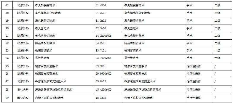 為進一步加強本院日間診療管理,規(guī)范日間診療服務(wù)行為,保障日間醫(yī)療質(zhì)量與安全,按照《醫(yī)療機構(gòu)日間醫(yī)療質(zhì)量管理暫行規(guī)定》、《手術(shù)質(zhì)量安全提升行動方案(2023—2025年)》、《提升醫(yī)療質(zhì)量安全行動計劃(2023-2025年)》等各類文件要求,現(xiàn)對我院日間手術(shù)目錄更新,具體公示如下: