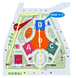 D口向南50米→左拐向東400米進(jìn)入北院區(qū)→進(jìn)入急診大廳→直行到達(dá)B樓(藍(lán)色樓) →乘扶梯至二樓→到達(dá)體檢部